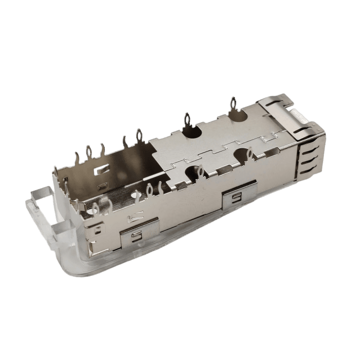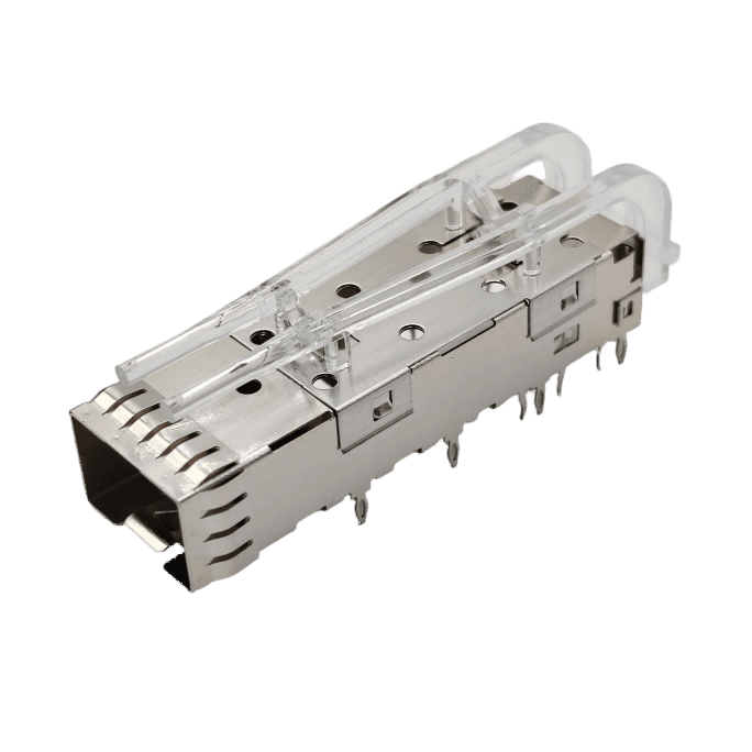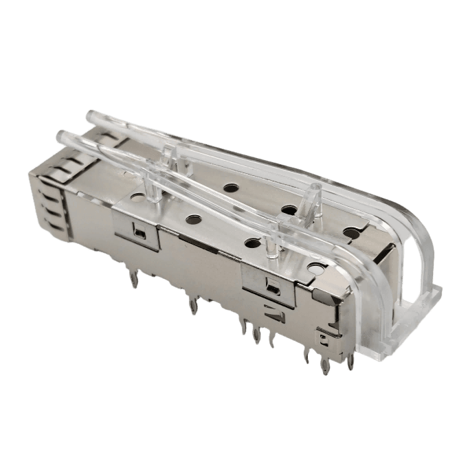81-111-Y0017-1 – Single-layer SFP +10G fiber cage crimping type 1 * 1 single port with high light guide column with three small feet in the middle