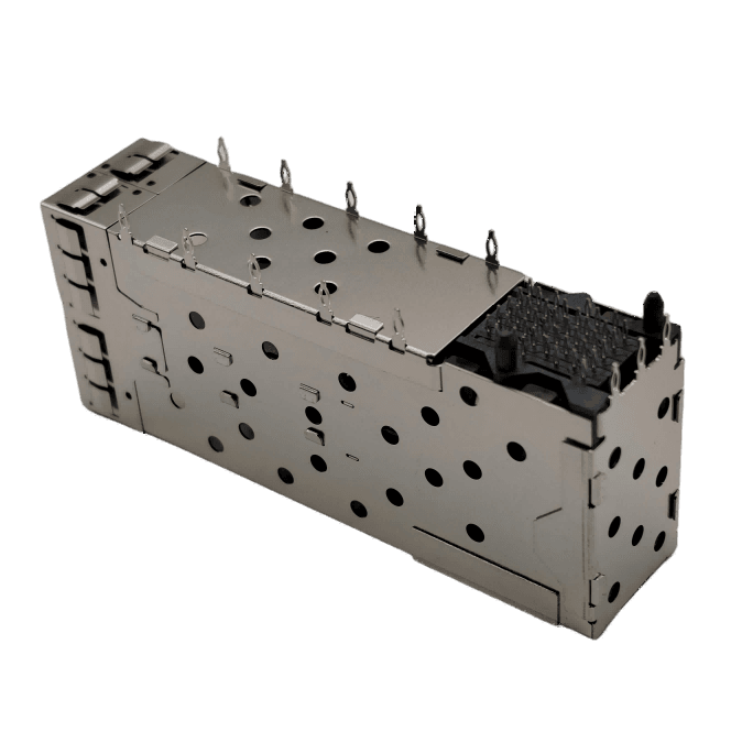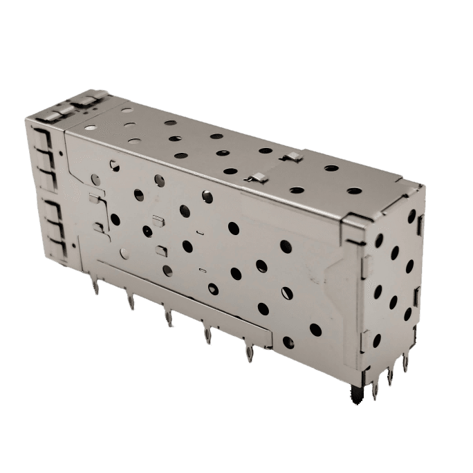 81-121-Y0013-1 – Double SFP+10G fiber cage crimping type 2*1 0.46MM pin with four light guide columns