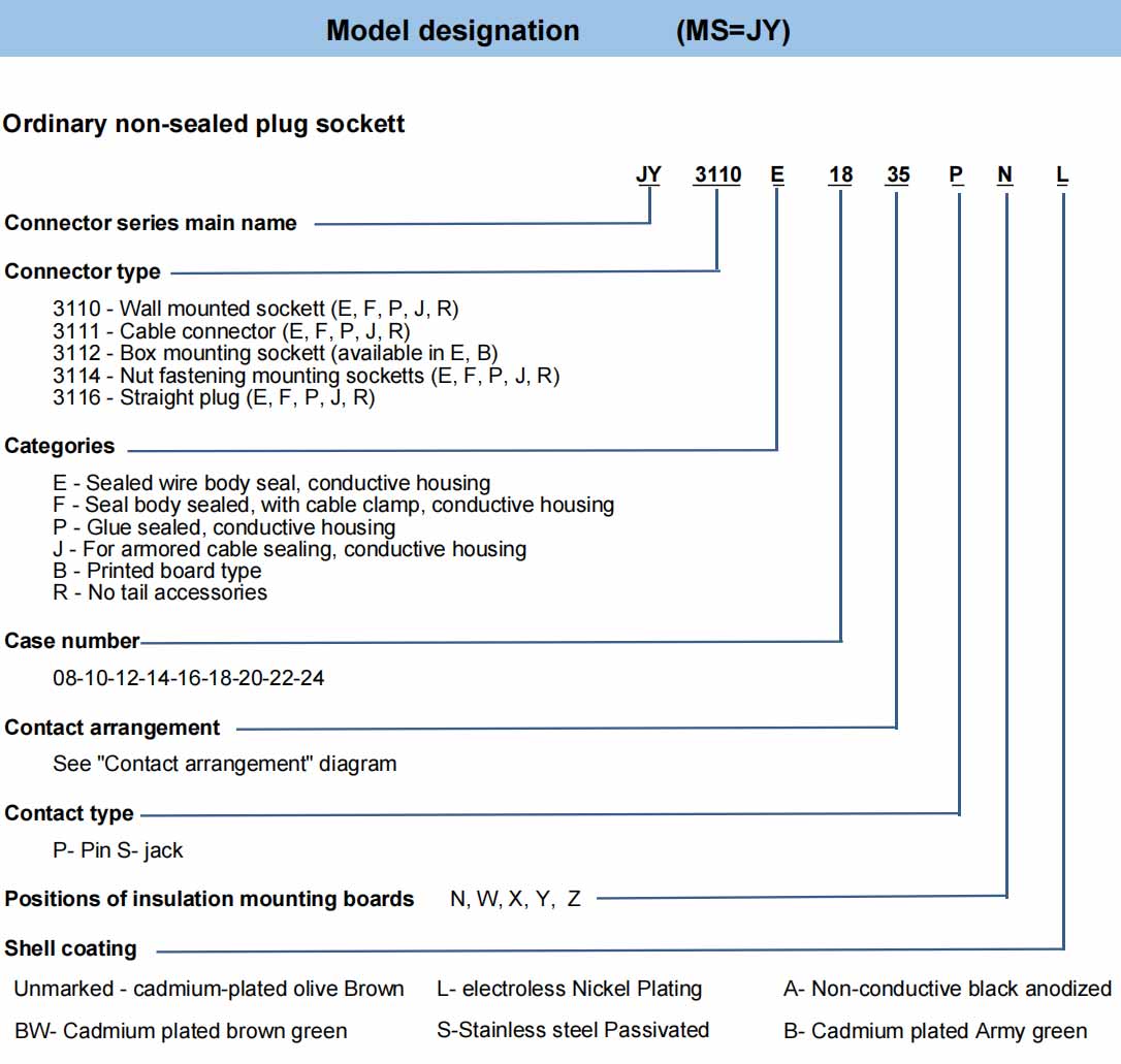 | MILspec:MIL-C-26482 | Shell material; aluminum alloy/stainless steel/titanium alloy/composite materials, etc. |