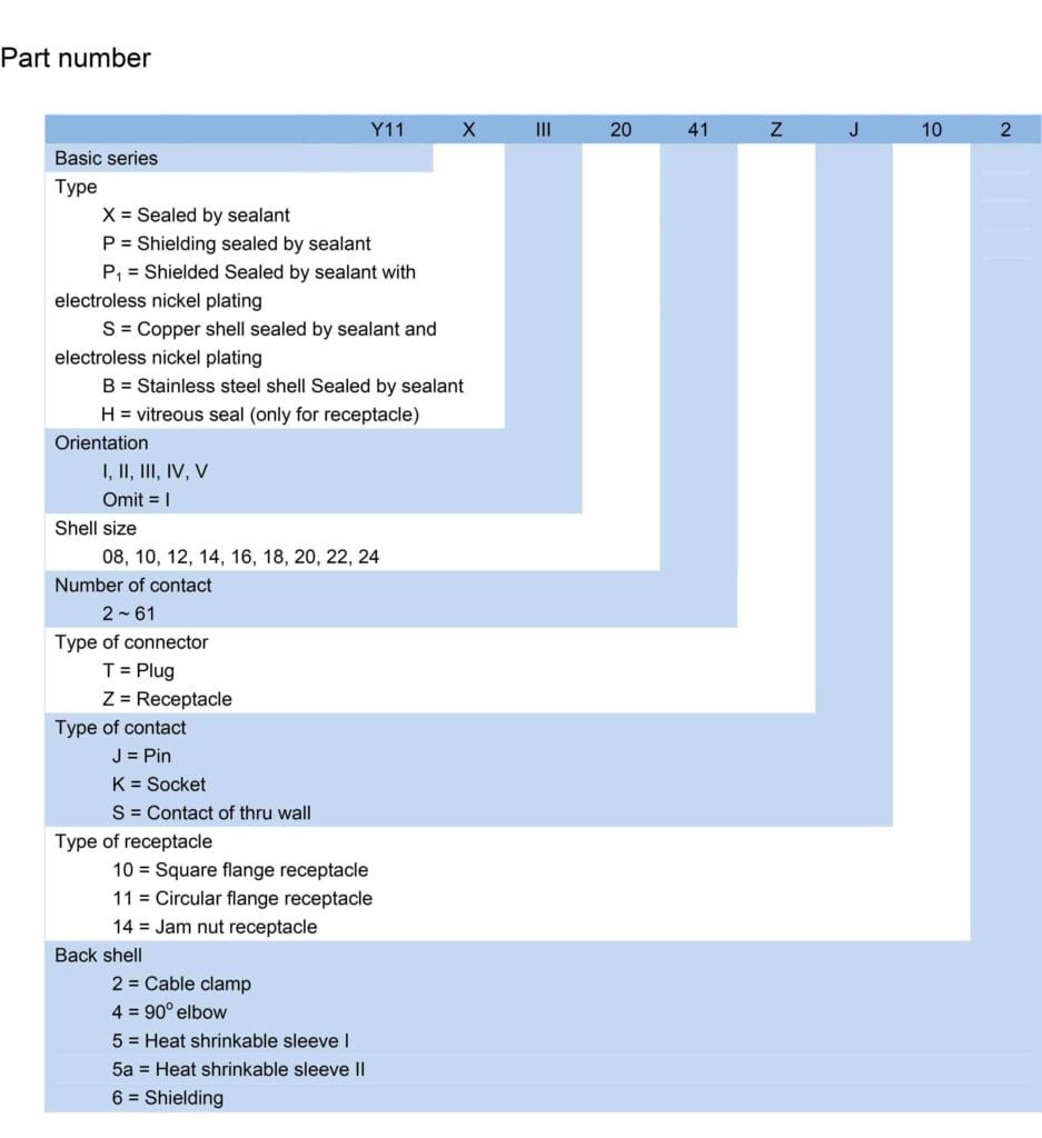 Conform to Chinese military connector standard GJB101A-1997. Y11 series is designed as quick interior bayonet coupling and quick release, small size and light weight, solder contacts.